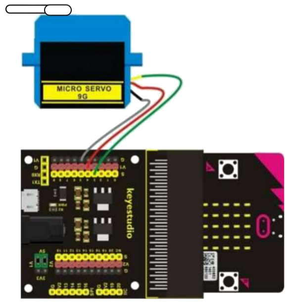 En la imagen de la izquierda puedes ver el montaje que debe hacerse para conectar el sevomotor a la placa de expansión de la micro:bit. Detalles: